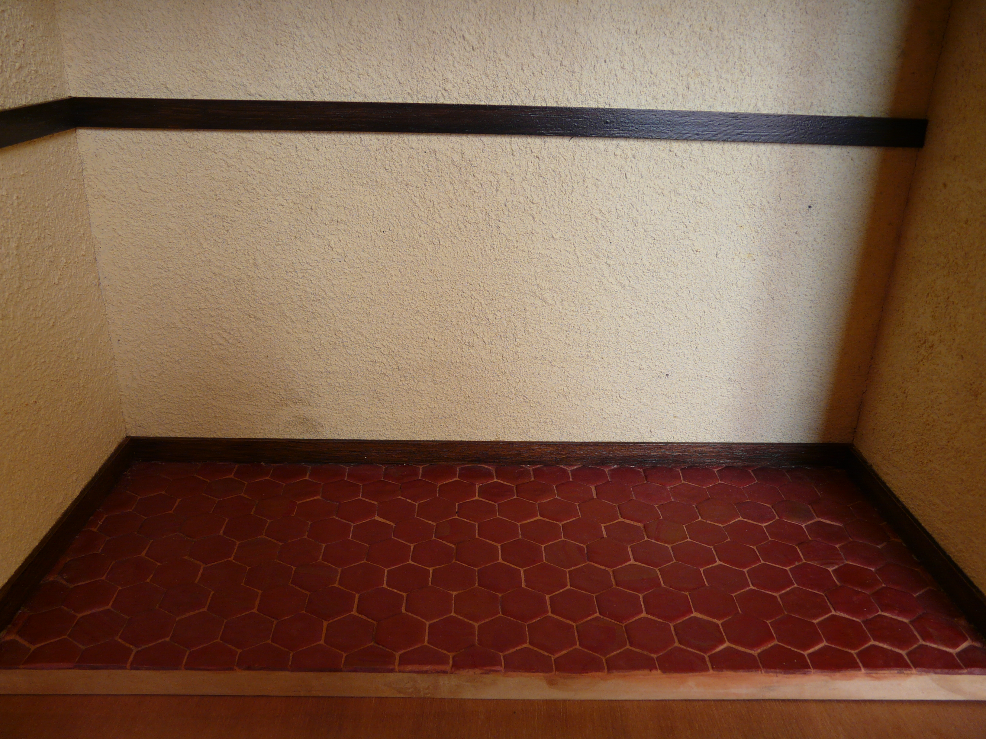 Tomettes faites une par une en pâte Fimo, taillées une à une à l’aide d’un écrou hexagonal. Elles sont ensuite légèrement poncées, puis jointées (véritable joint à carrelage) puis cirées.