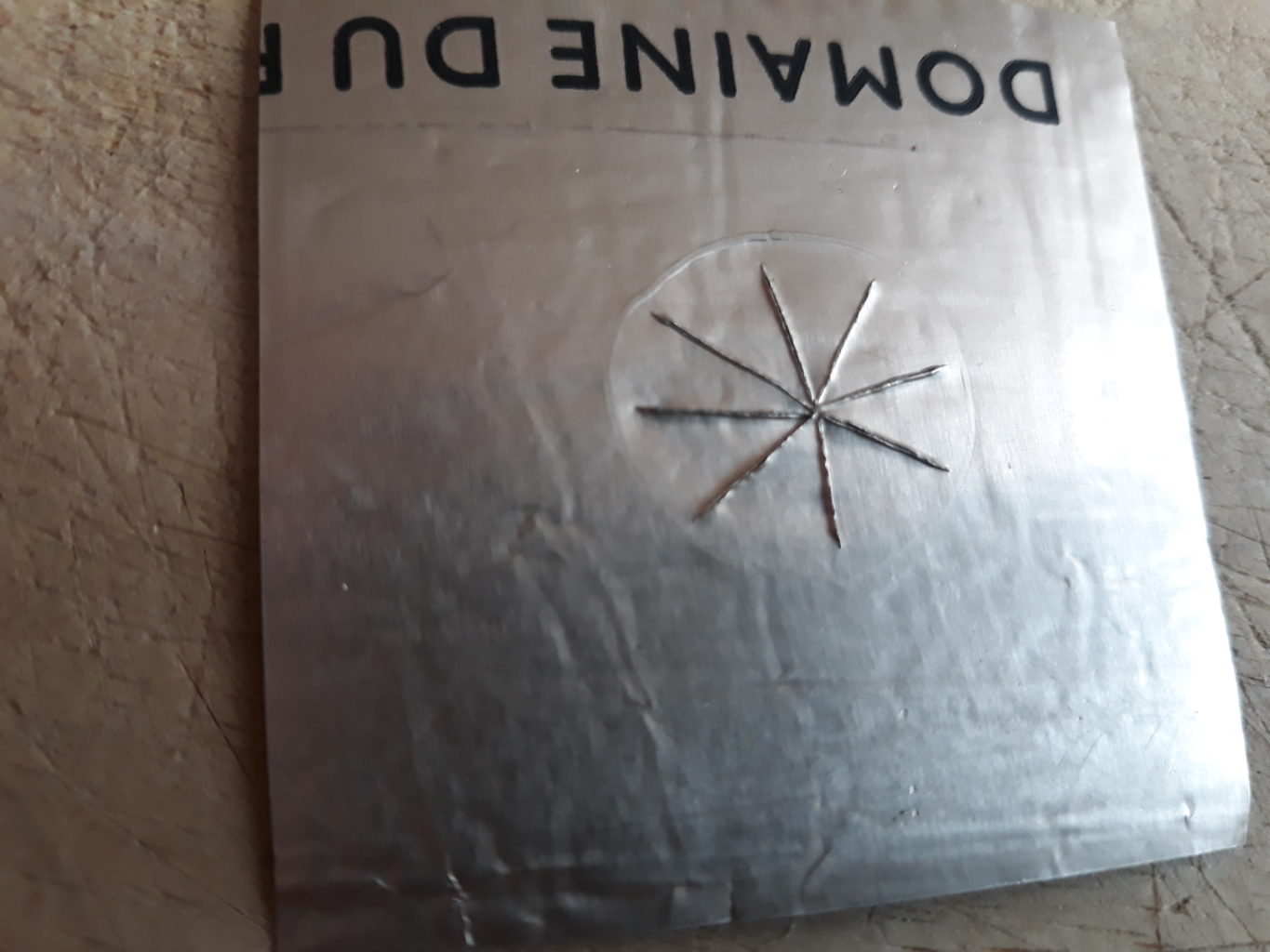 Et hop !Préparation de la feuille d’étain en découpant la capsule puis en lissant longtemps avec la pulpe du doigt.Collage de la feuille d’étain sur le morceau de bois et marquage du trou central (découpes en étoile faites au cutter)