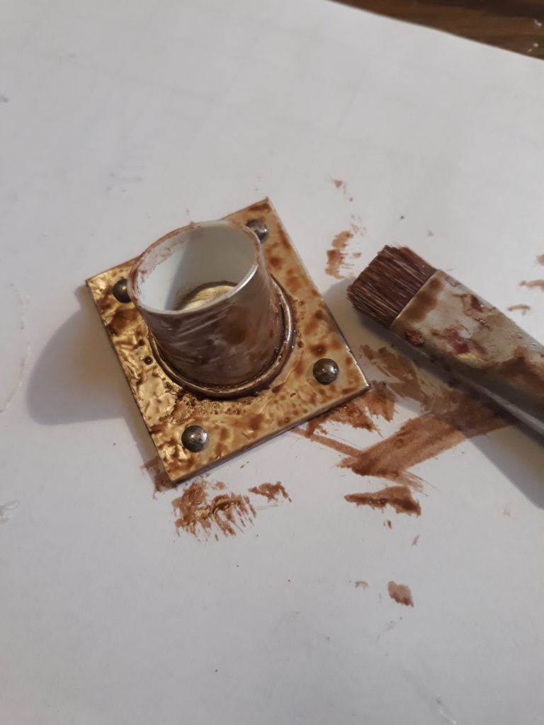 La colle dissout un peu la pellicule colorée de la feuille d’étain, mais c’est sans conséquence, sinon que ça ajoutera au côté “vieilli” de l’ensemble, ce qui est parfait.Vue du dessus