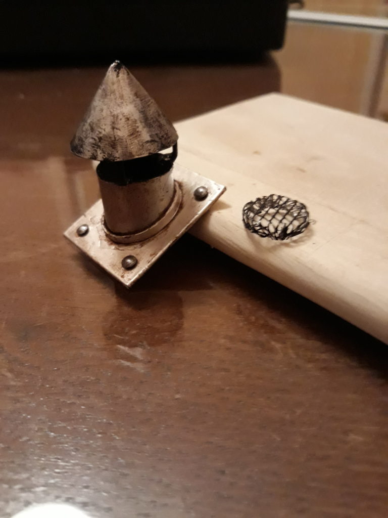 Atténuation avec un petit morceau de chiffon.Place au “chapeau” de la cheminée maintenant. Tout commence avec un gabarit fabriqué dans un morceau de papier.Puis choix de deux feuilles d’étain qui vont être collées dos à dos pour donner de la rigidité à l’ensemble : l’une de la même couleur que le socle et similaire à celle du bouchon (pour l’extérieur), l’autre gris anthracite pour l’intérieur.Les deux feuilles une fois collées et la colle bien séchée, report du gabarit.Découpe, et marquage sur la maquette en papier des emplacements des futures “pattes d’assemblage”, afin de reporter ces repères sur la feuille d’étain découpée.Dans l’étain restant, découpe de trois rectangles qui vont servir à constituer les fameuses “pattes d’assemblage”; elles doivent être assez rigides pour tenir le tout, mais rester assez flexibles pour être traitées comme du fer forgé…Pliage des rectangles (en plusieurs fois sur eux mêmes) grâce aux petites pinces brucelles que je me réjouis d’avoir achetées.Le moment sympa de la mise en colle du petit chapeau.