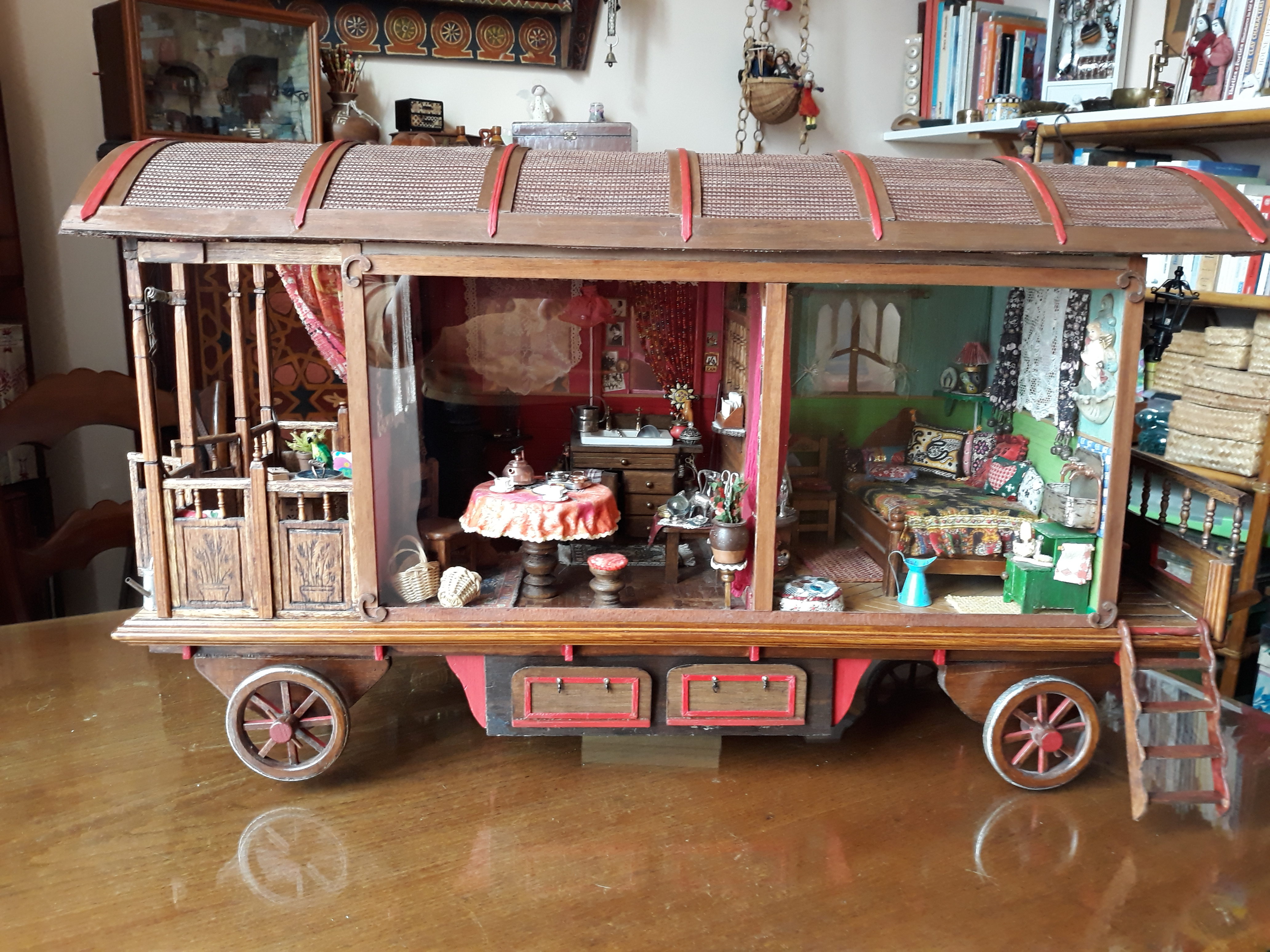 C’est par hasard que je tombe sur votre site. Ayant depuis quelque temps , envie moi aussi de une roulotte votre magnifique “reportage ” m’a donné encore plus envie d’en fabriquer une à mon tour, pour me changer un peu des maisons miniatures. Bravo pour la réalisation, elle est superbe extérieure comme intérieure.